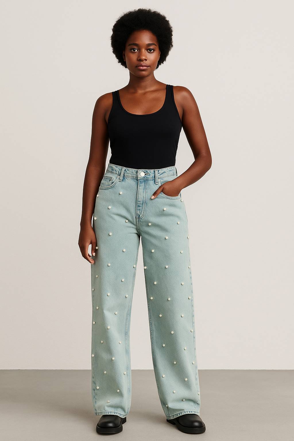 Step up your style with our Faded Blue Retro Denim Trousers with Pearls. Combining a vintage-inspired, faded blue wash with delicate pearl embellishments, these trousers add a touch of elegance to your casual look. The perfect balance of retro charm and modern sophistication.